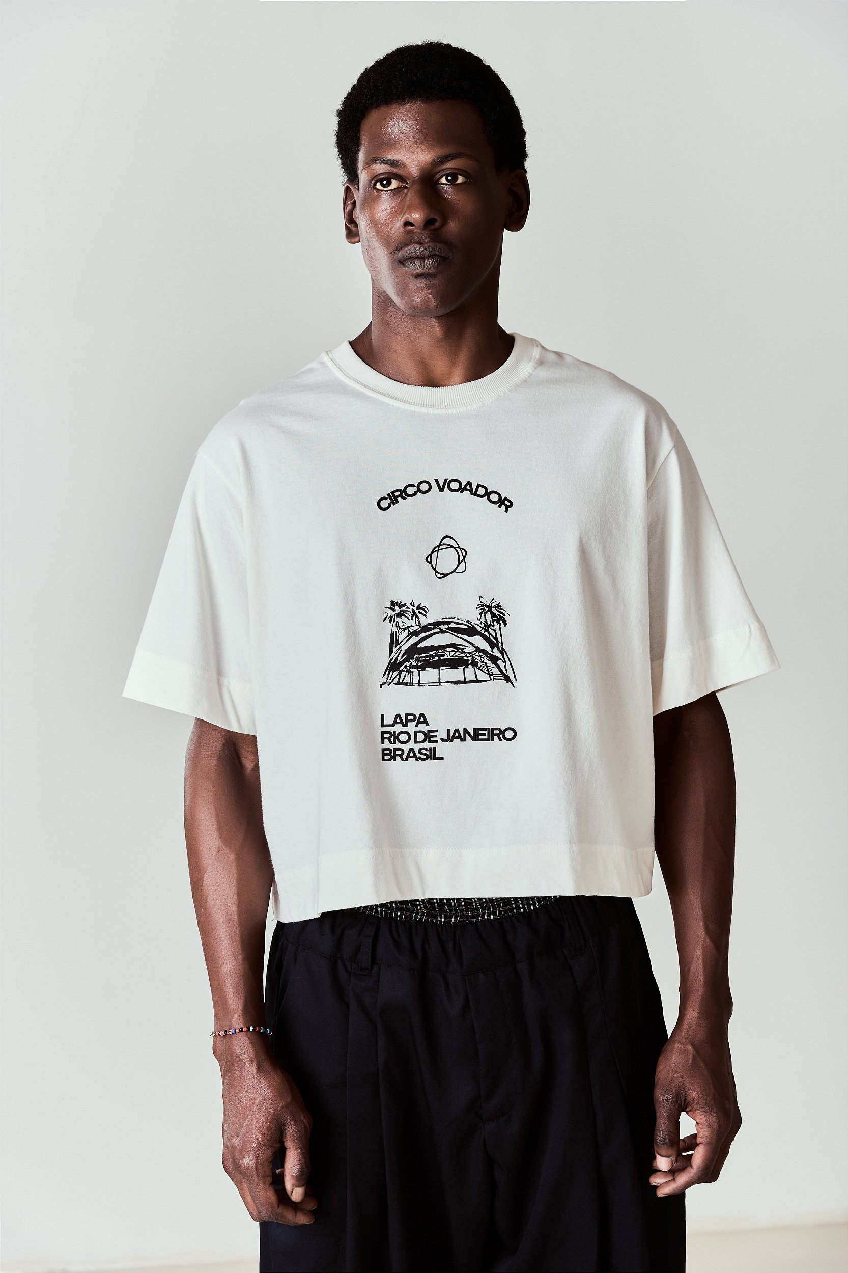 Cropped com modelagem levemente quadrada e comprimento na altura da cintura.