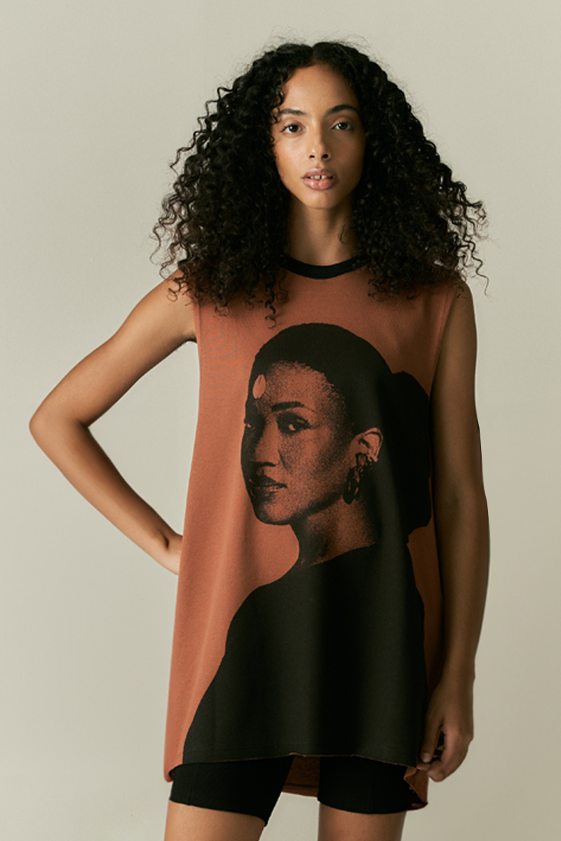 FEITA EM MALHA COM PONTO CREPE, MANTEM UM ASPECTO RÚSTICO E TOQUE MACIO. A PEÇA TEM GOLA RIB CONTRASTANTE PRETA E CORTE A FIO NAS CAVAS E BAINHA.