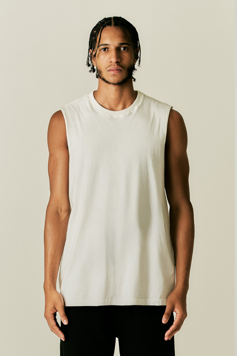 Esse regatão é uma peça especial. Com modelagem levemente alongada, cavas amplas cortadas a fio e gola canelada.