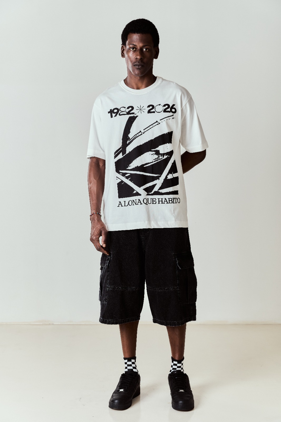 ESTAMPA: "A LONA QUE HABITO". FEITA EM MALHA 30 FIOS COM MODELAGEM AMPLA, LEVEMENTE ALONGADA, AMACIADA E PRÉ-ENCOLHIDA. MANGAS UM POUCO ACIMA DO COTOVELO, GOLA RIB 2,5 CM.