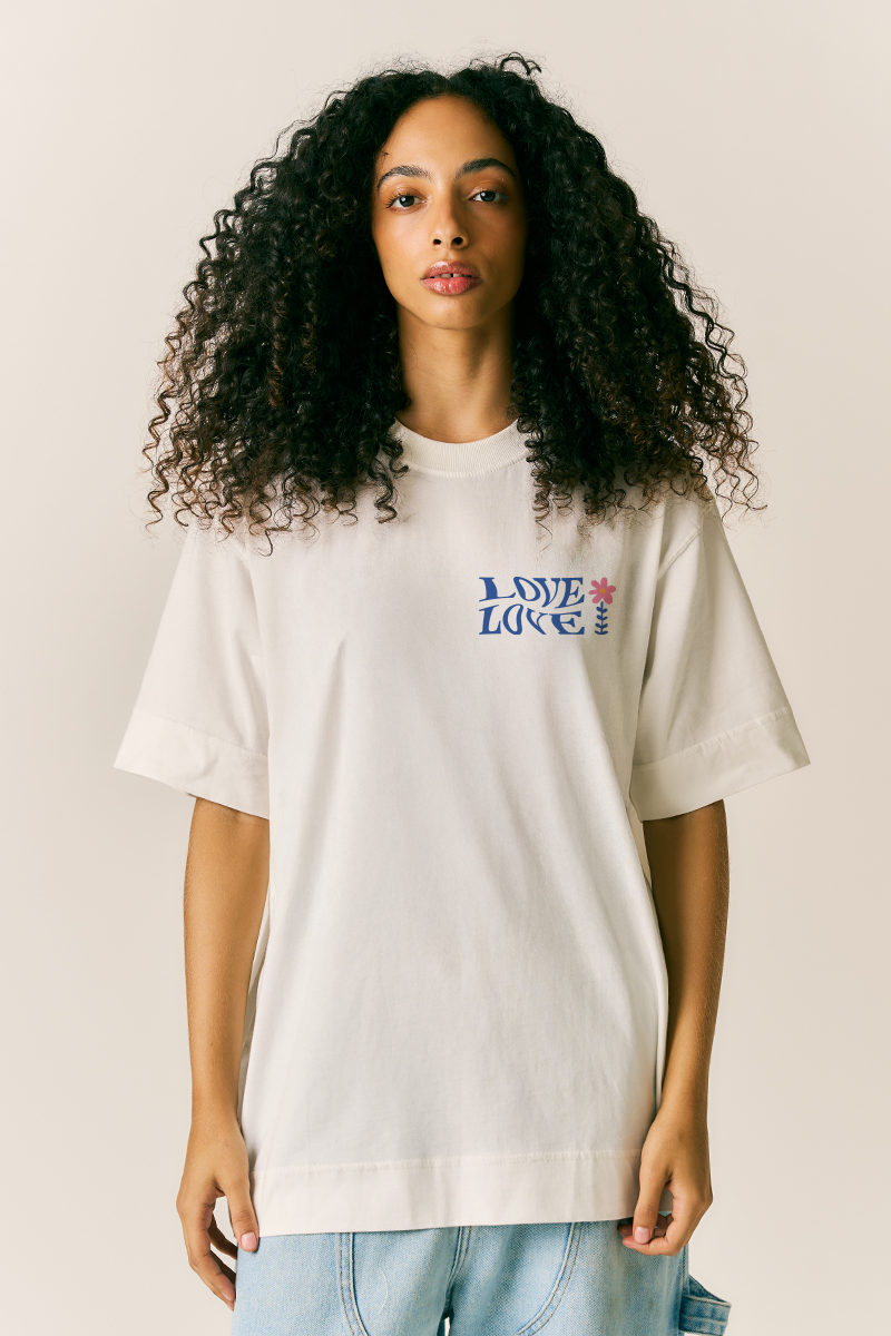 T-SHIRT FEITA EM MALHA 30 FIOS COM MODELAGEM AMPLA, LEVEMENTE ALONGADA, AMACIADA E PRÉ-ENCOLHIDA, MANGAS UM POUCO ACIMA DO COTOVELO, GOLA RIB 2,5CM..